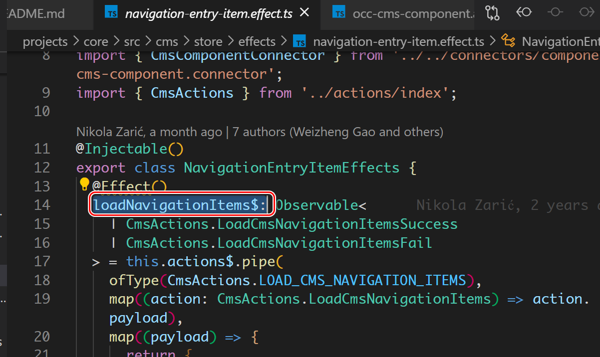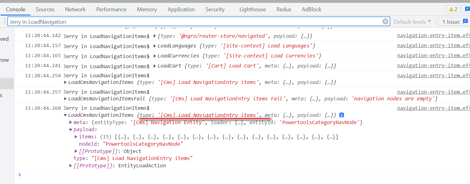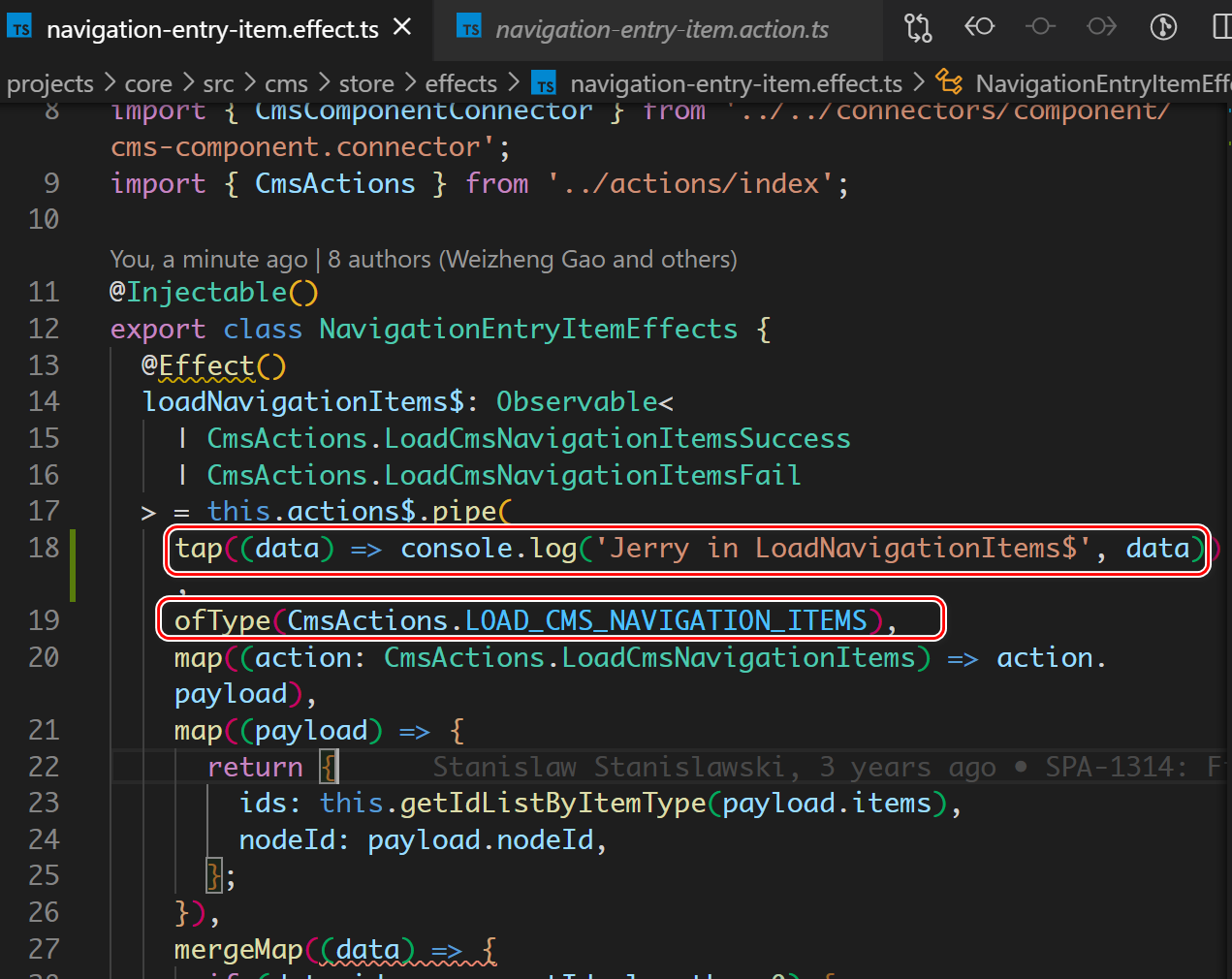当 Spartacus 其他地方的代码触发 CmsActions.LOAD_CMS_NAVIGATION_ITEMS 时,我们这个 loadNavigationItems$ 里第18行的 ofType 就会触发。