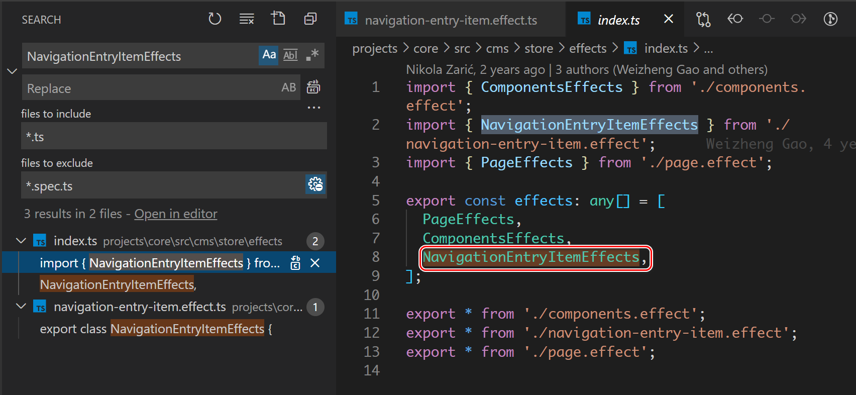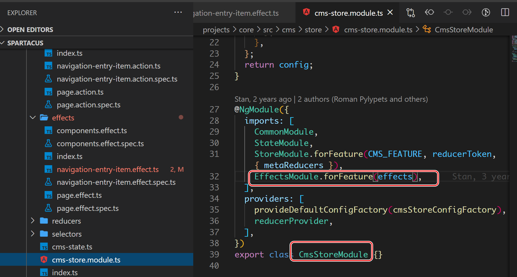 CmsStoreModule 的 imports 区域,包含了导出的 effects 数组。