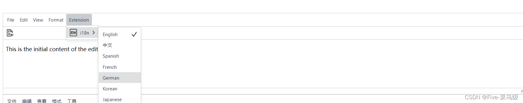 但是问题来了 因为 tinymce 的菜单面板 是动态生成 , tinymce 官方 这一块的逻辑并没有考虑到 不同语言实例在 同一页面,【具体,可以近似看成 原型链的问题 】,所以菜单面板的语言就会出现 生成的是最后一个语言配置, 如下图 英文实例 菜单 生成 结果为中文