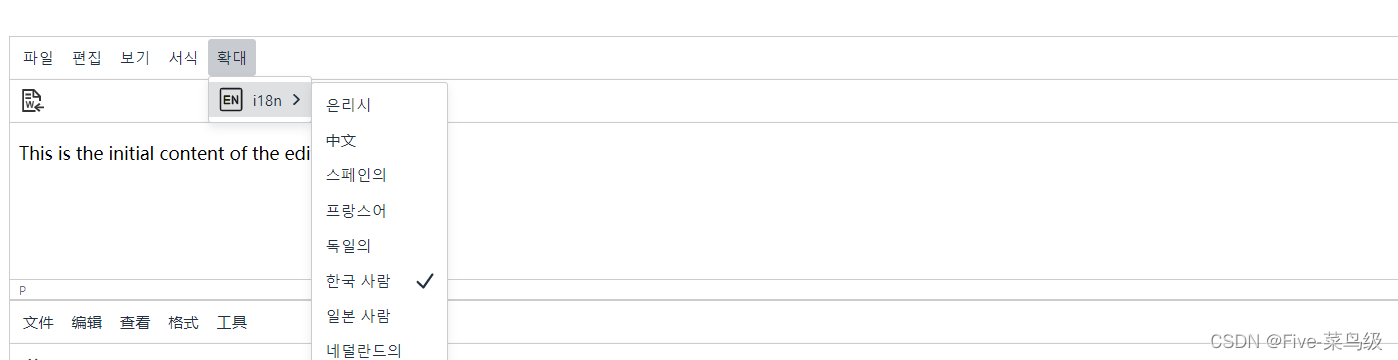 注意 需要每一个tinymce editor 实例 完成之后才能进行实例下一个 所有需要采用 tinymce.init({...}).then(()=>{ tinymce.init({...}).then(()=>{ ... })... }) 的用法。 否则只能得到 最后一个实例的语言版本