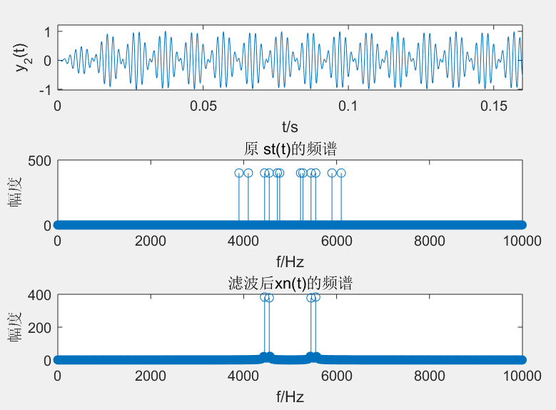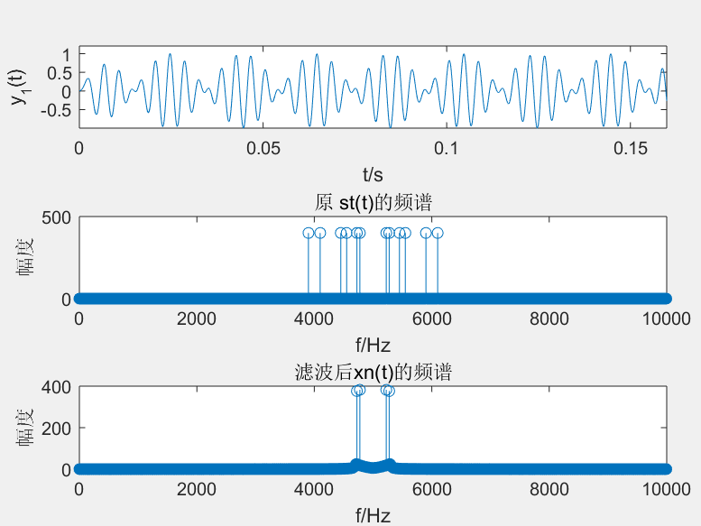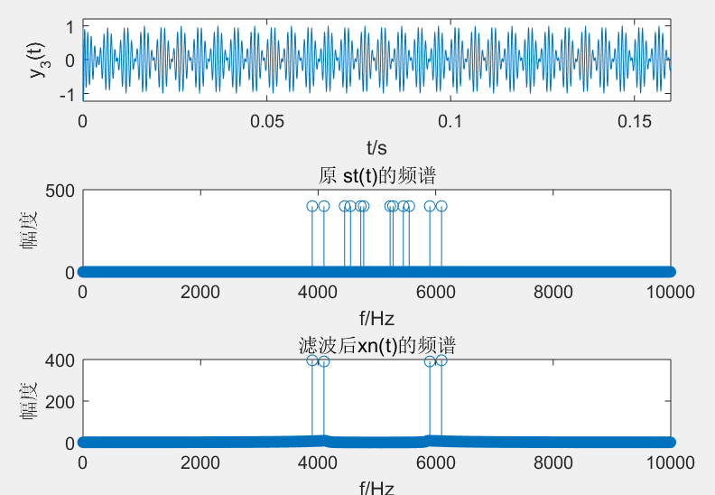 title('滤波后xn(t)的频谱');xlabel('f/Hz');ylabel('幅度');