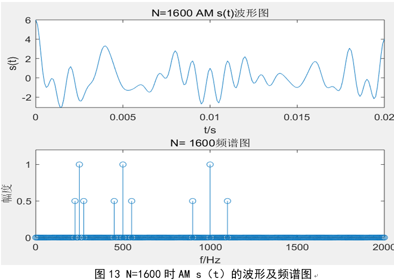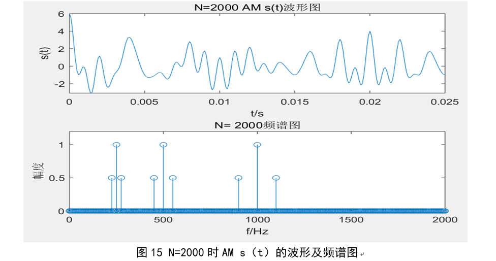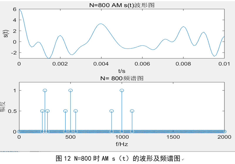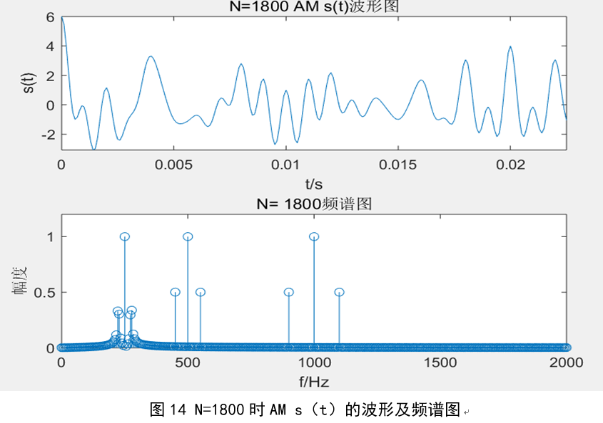 因为信号s(t)时周期序列,频谱分析时要求观察时间为整数倍周期。因此,采样点数N=800,1600,2000时,对s(t)进行N点FFT可以得理想谱线,而当N=1800时,不是400的整数倍,则不能得到。当将该调幅信号修改为AM信号后,s(t)的频谱中有较大的频谱分量。如图所示。