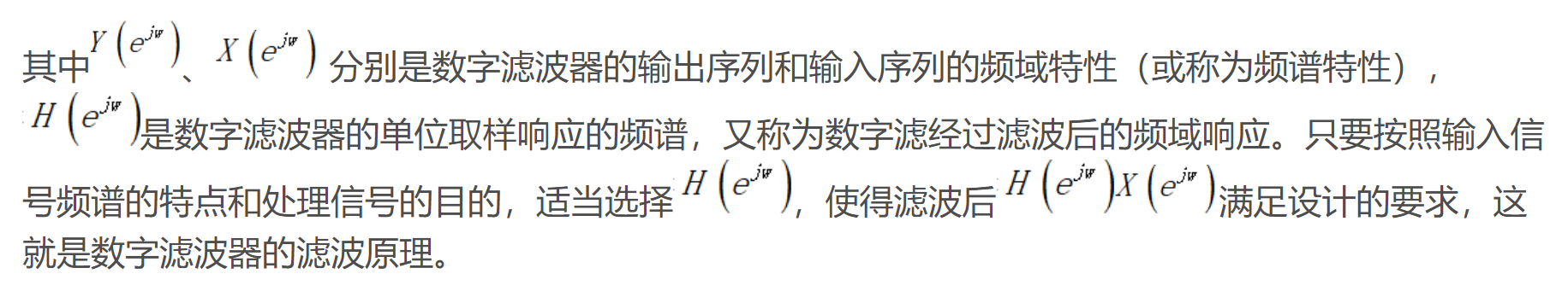 数字滤波器是对数字信号实现滤波的线性时不变系统。数字滤波实质上是一种运算过程,实现对信号的运算处理。输入数字信号(数字序列)通过特定的运算转变为输出的数字序列,因此,数字滤波器本质上是一个完成特定运算的数字计算过程,也可以理解为是一台计算机。描述离散系统输出与输入关系的卷积和差分方程只是给数字信号滤波器提供运算规则,使其按照这个规则完成对输入数据的处理。时域离散系统的频域特性:
