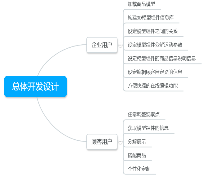 - 对于企业用户,该平台实现如下的功能:可以加载产品模型,可以将制作的三维模型添加到特定的虚拟环境中,前提是符合系统平台支持的文件格式的三维模型文件;可以构建3D模型组件信息库,即企业或商家将商品的3D模型导入到该平台中,平台将该模型中各个组件模型的关联信息与构成信息,封装存储在云存储中,以便日后组合使用;设定模型组件之间的关系,即企业或者商家可以通过一些简单的便捷的操作的方式建立组件间的关系,形成树状结构;可以设定组件运动行为参数,即企业或者商家可以设定模型的分解状态;设定组件的文字说明信息,即企业或者商家可以对组件添加商品文字信息说明,或者重新命名,或者添加一些参数,设定和编辑顾客用户自定义的信息,即企业或商家可以设定顾客用户自定义的权限;方便快捷的在线编辑功能,即提供一个在线编辑器功能,可以供商家实时修改,实时预览,简单操作即可完成商品模型的制作,商品模型的运动分解参数,商品信息的添加等。