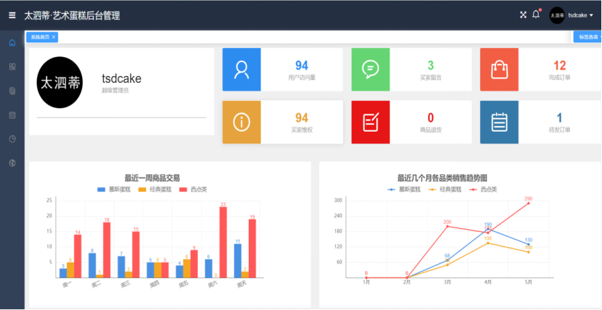 后台管理主要用到了Vue框架和Element UI组件实现包括主界面、登录界面、商品管理、商品列表、订单管理、网站管理、数据管理等,便于商家用户管理商品,管理订单和管理商品模型。★ 主界面:一进入后台管理,就将给商家关心的订单数据,访问数据,营销统计图表等展示出来。便于商家快速直观获得,平台运营概况以及待办事项。后台管理的首页界面效果图如下图所示:
