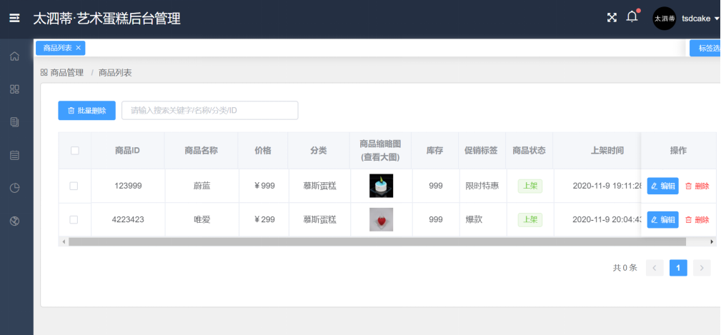 ★ 商品列表:当企业或者商家点击商品列表,那么后台管理系统将会把当前所有的商品信息以表格形式展示出来,便于企业或者商家快捷的对自家的商品集中查看,批量处理。同时也可以点击操作栏对单个商品进行编辑或删除,同时支持多关键字筛选功能,可以输入商品名称、商品的分类,或者商品的唯一ID作为关键字,快速查找想要处理的商品。商品列表效果图如下图所示: