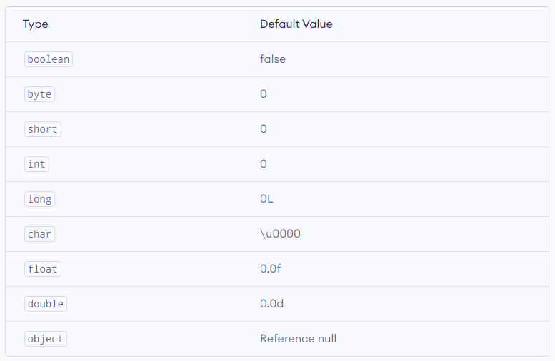 对于其他 Java 引用类型,默认值是null,这意味着引用类型的属性没有被分配任何值。