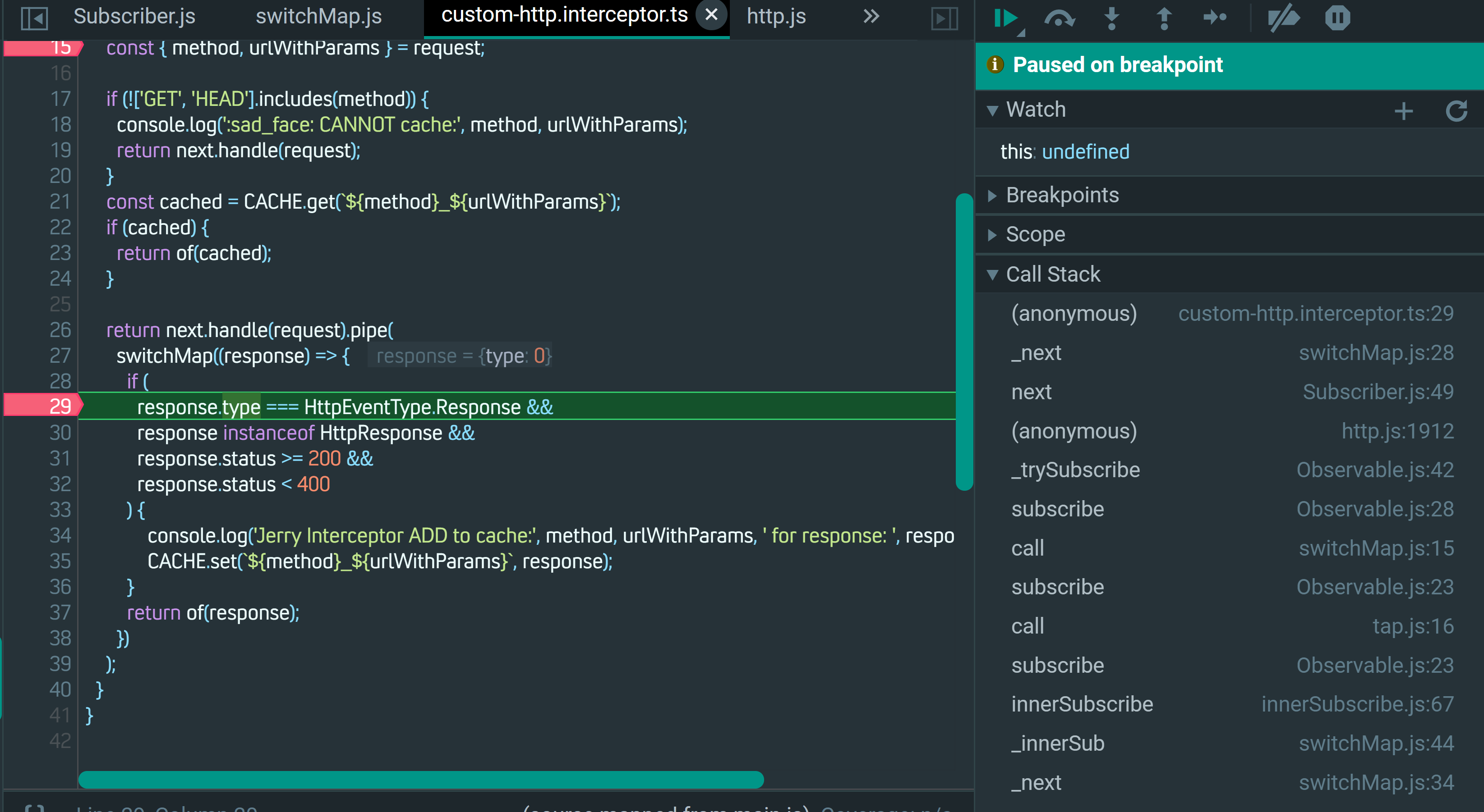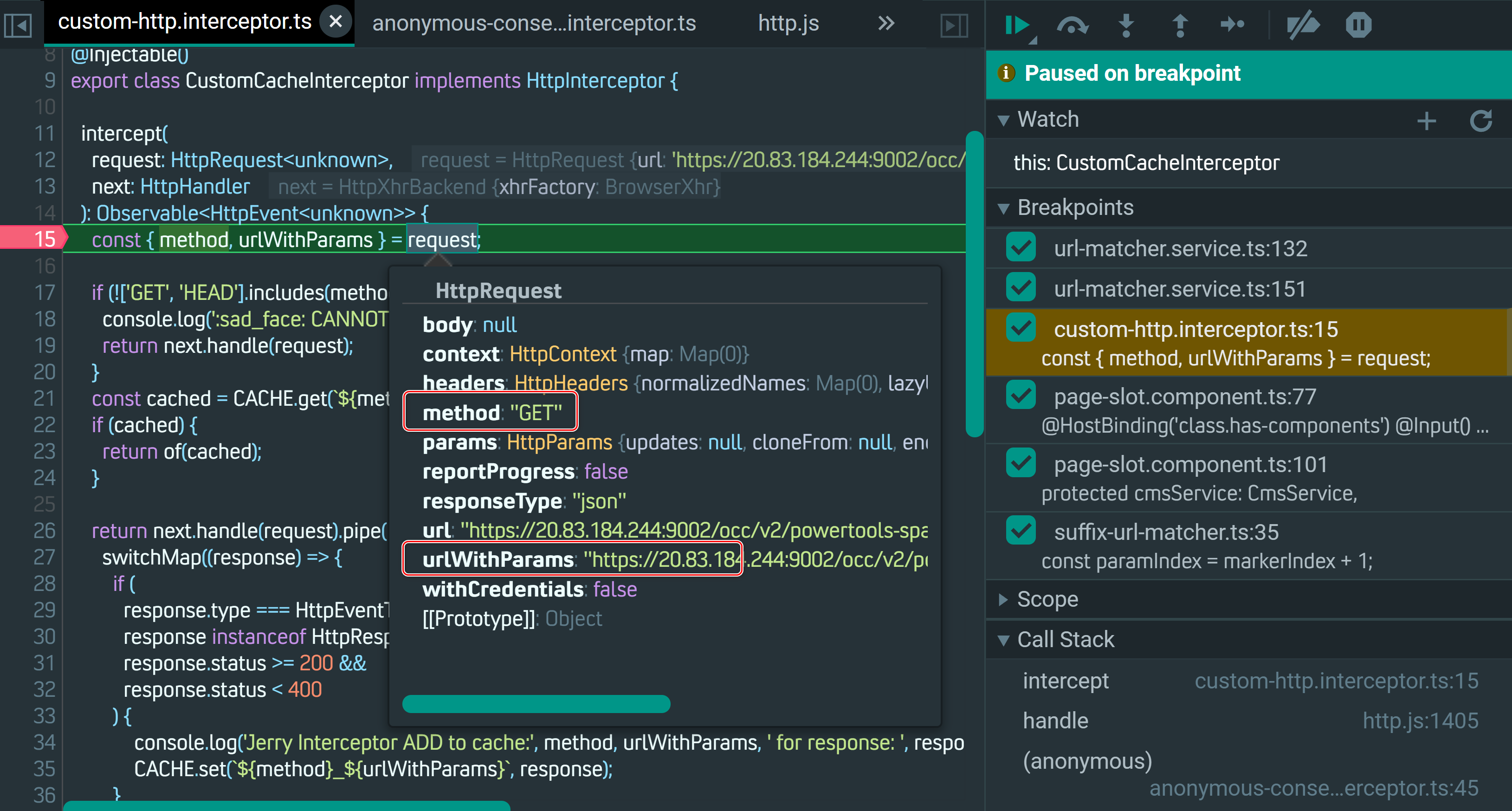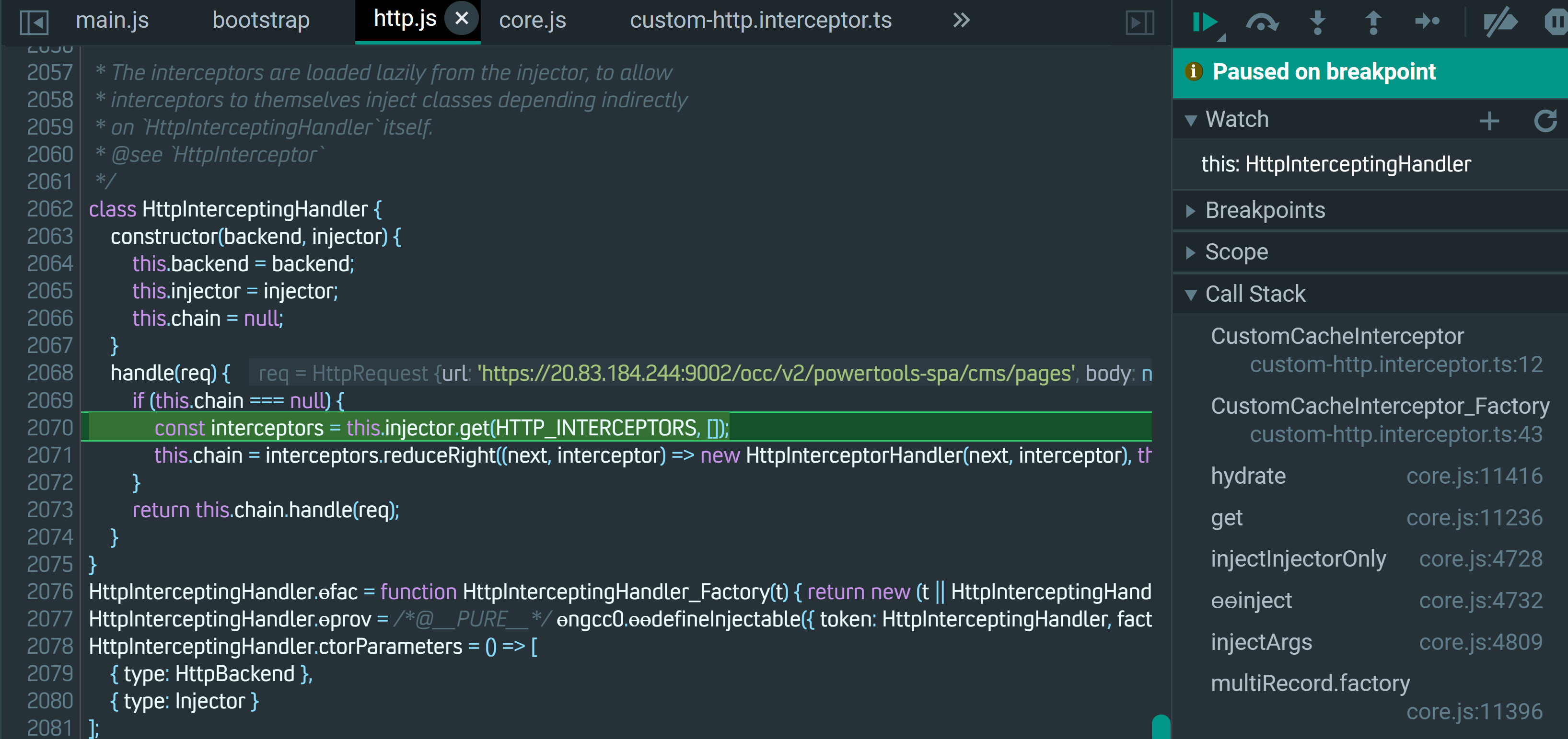 设置断点来观察自定义 HTTP interceptor 运行时原理: