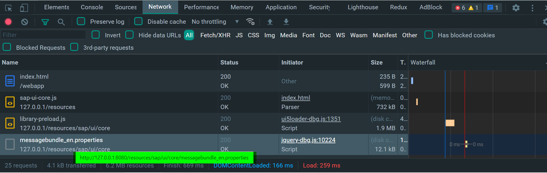 运行我们编写的 SAP UI5 应用,此时就能发现,所有 SAP UI5 库的资源文件,都由本地 127.0.0.1 的 HTTP 服务器提供了: