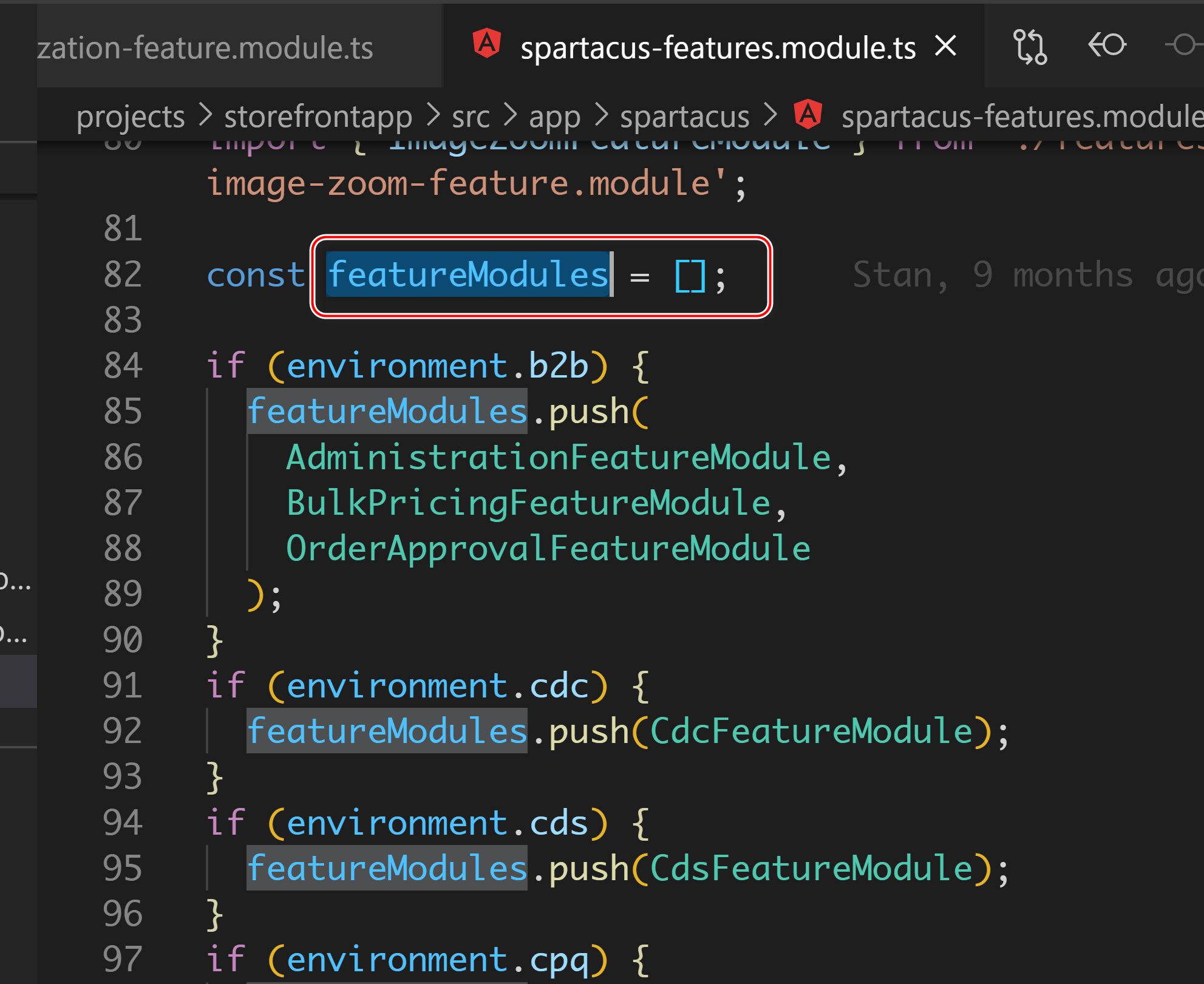 SpartacusFeatureModule import 的 module 包含两部分,mandatory 的 core module(硬编码),以及上文描述的 featureModules 数组里的 module 两部分。