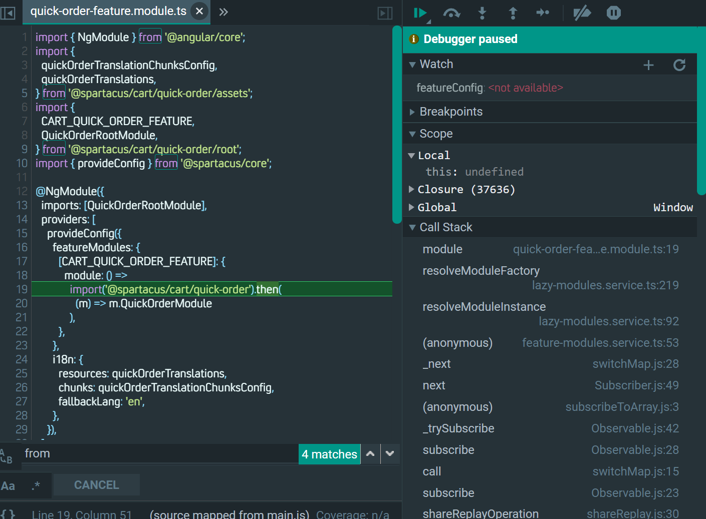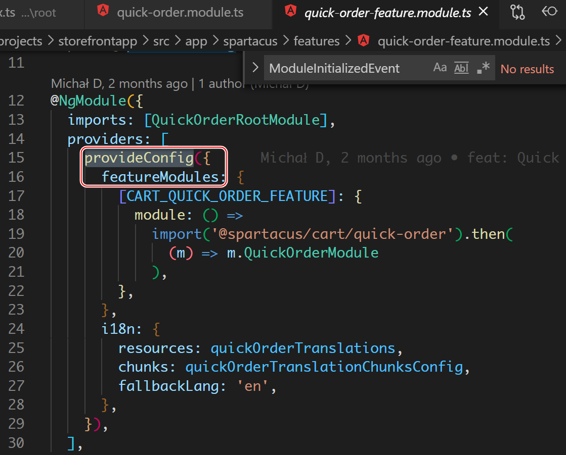 这个 json 对象是 Spartacus 代码里通过 provideConfig 注入到配置对象 config 中的,字段名称为 featureModules: