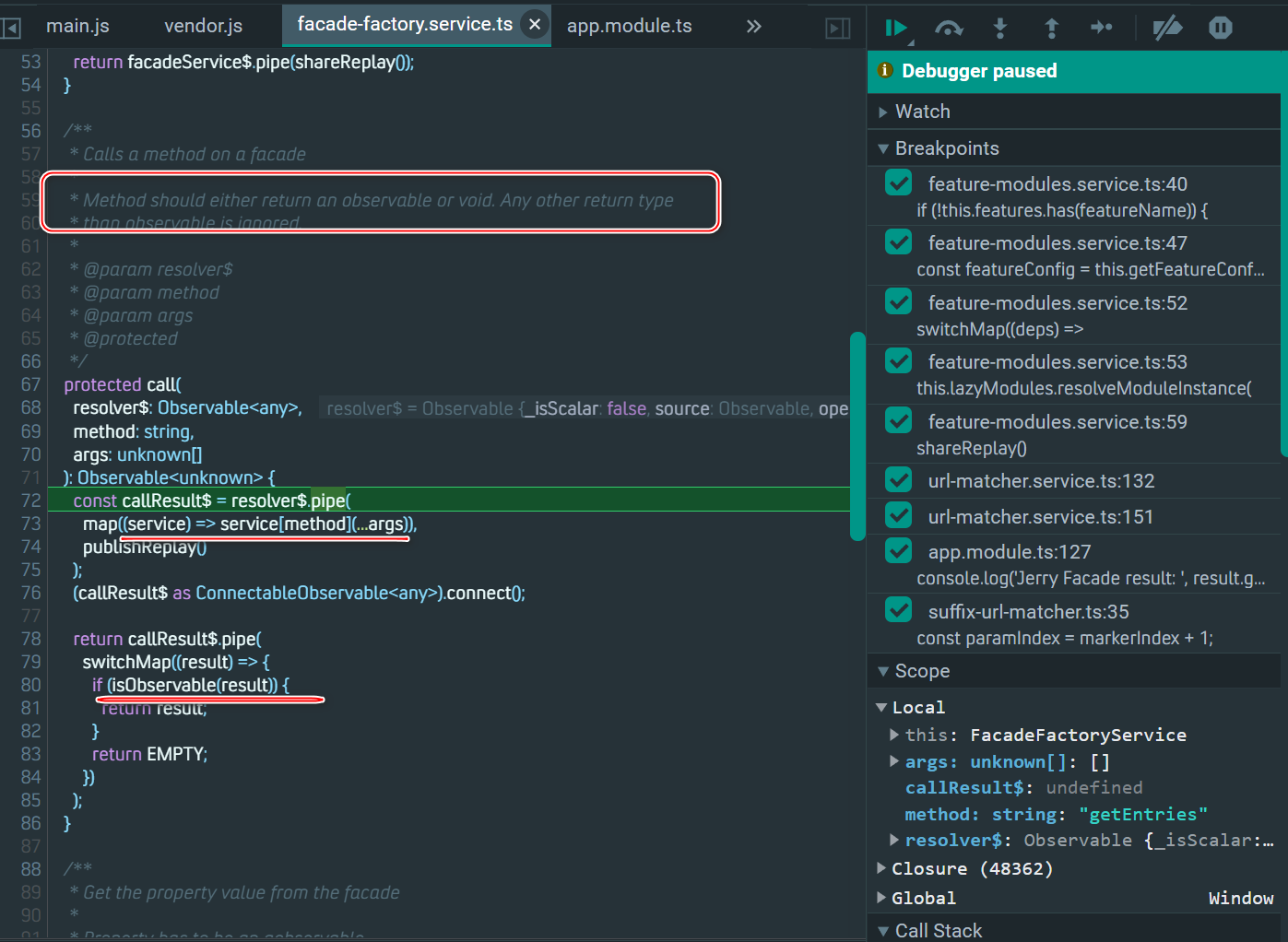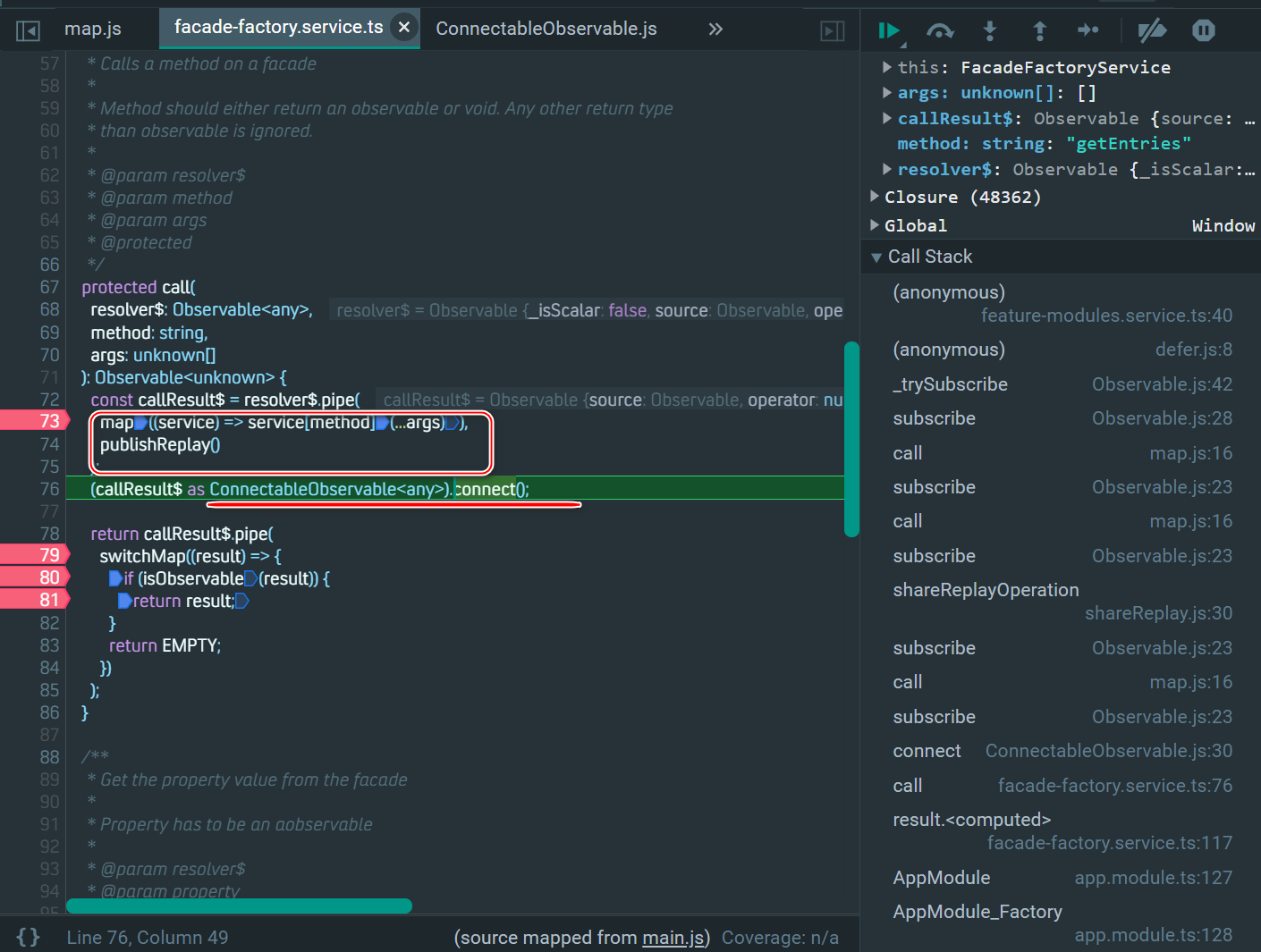 这里我们调用 Rxjs 标准的 ConnectableObservable 的 connect 方法,触发第 73 行 pipe 传递进去的 Operator 的执行: