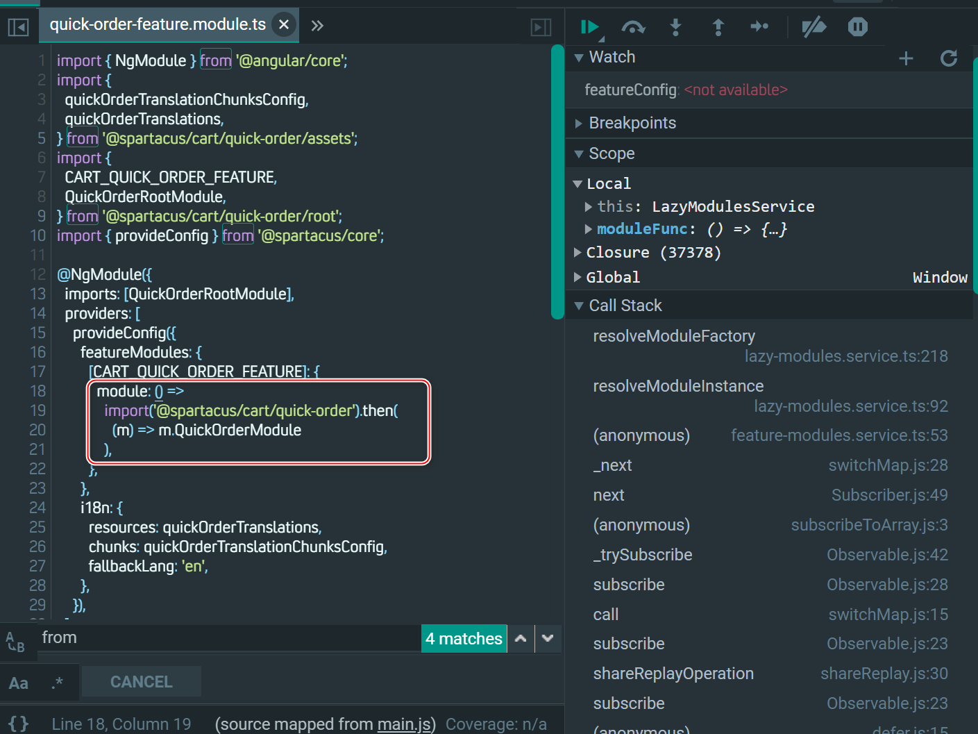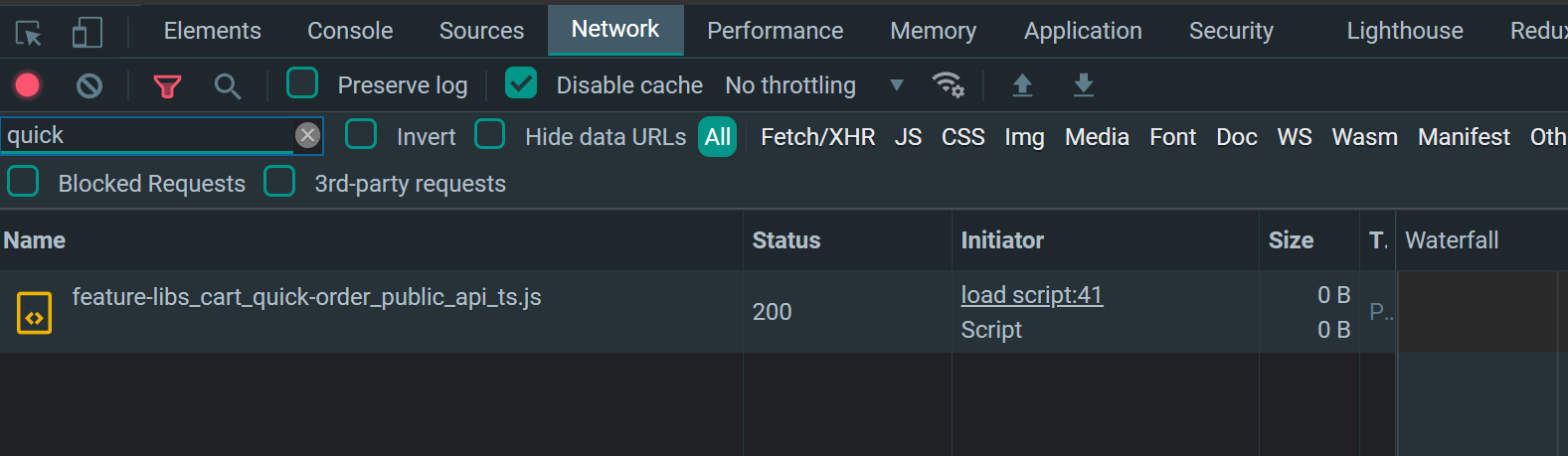 从下图可以确认,确实上图19行 import 指令,会触发 spartacus/cart/quick/order chunk 的加载: