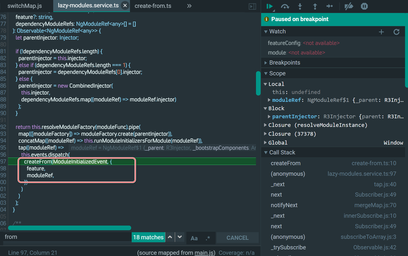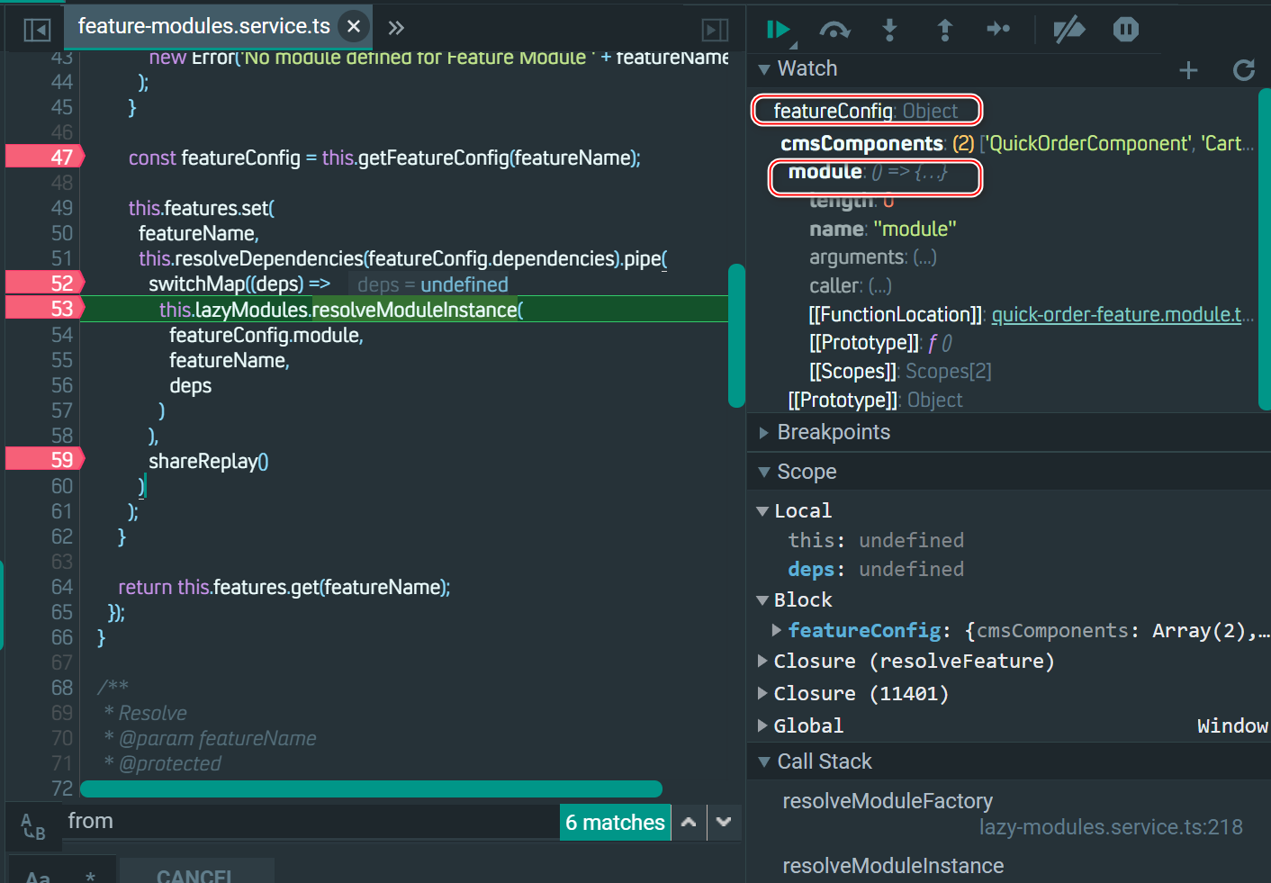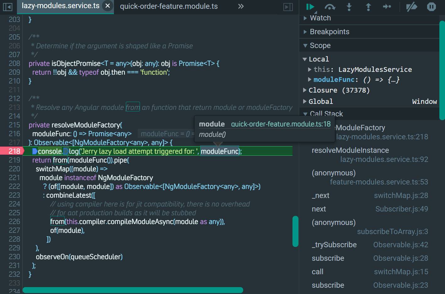 所以当代码执行到下图第 220 行 switchMap 时,传入的 module 就是加载成功的 QuickOrderModule 类: