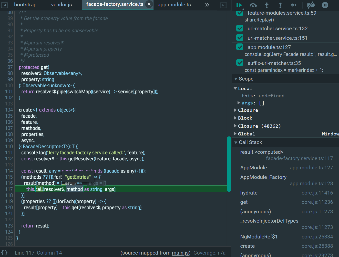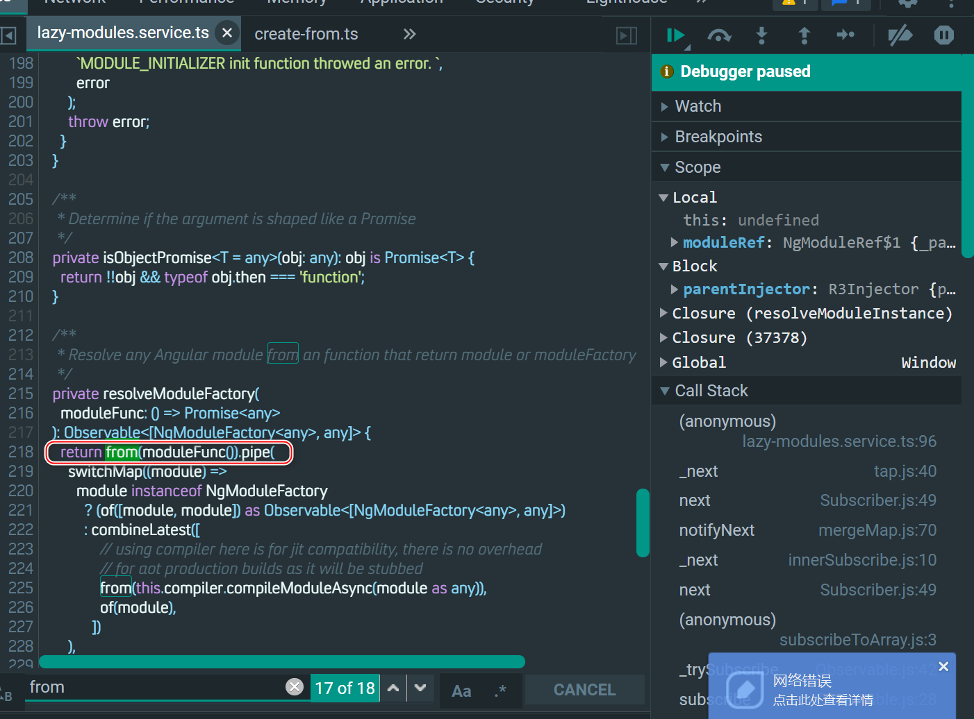 该入口位于下图第 218 行的 rxjs from Operator 调用: