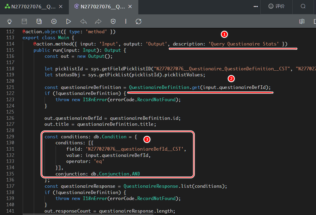 来到名为 Main 的 class,这就是返回问卷填写结果的 HTTP 请求的后台实现入口。图例1 的 description 字段,说明这个方法用于实现 Query Questionaire Stats 功能,图例2 的 QuestonaireDefinition.get 方法,通过 Questionaire 定义 id,返回该问卷的模型明细,然后在图例3 通过拼接数据库查询条件 db.Condition,为即将发起的数据库查询做准备。