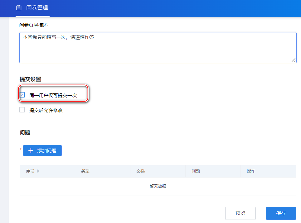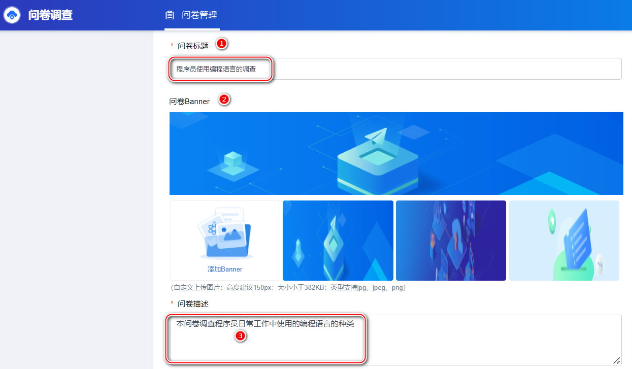 可以维护问卷标题,Banner 和描述信息,让填写问卷的人员,能够一目了然知道该问卷应该如何填写,以及调查的目的: