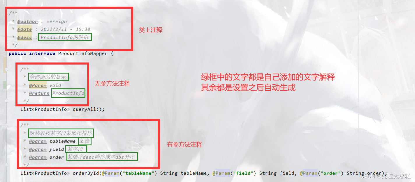 实现效果:不用手写即可自动生成如下图的类上注释和方法上的注释,我们只需要填写方法注释的参数和返回值文字描述即可,大大节省了代码开发的时间提高代码开发效率。