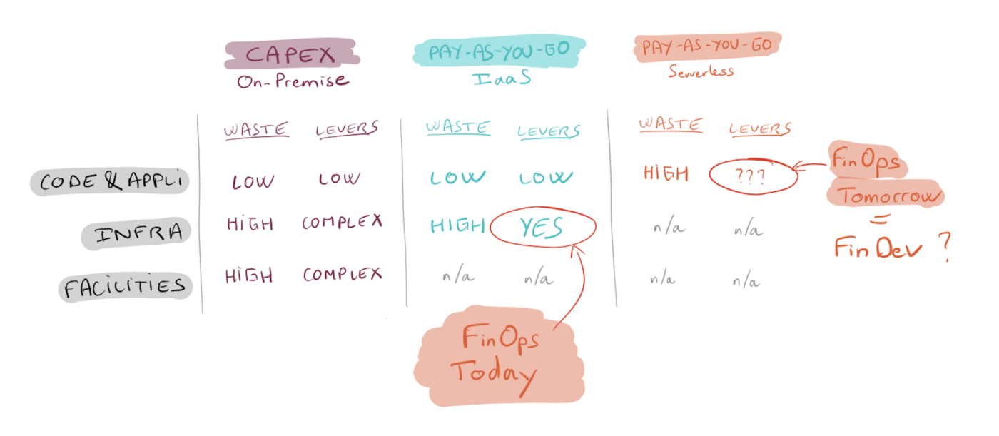 在一个假设的100%无服务器和随需应变的世界中,FinOps因此将成为一个以代码为中心的优化任务,并移交给开发团队。可能收益较低,因为储蓄更有限,更难获得。