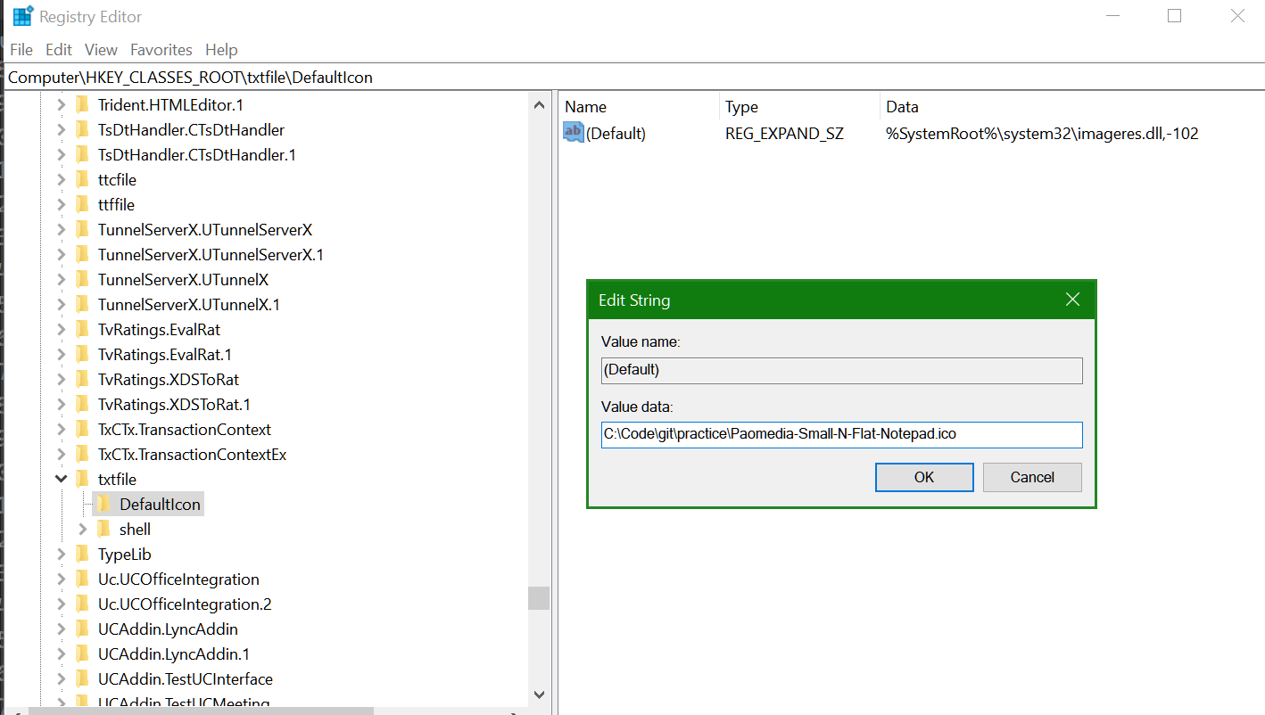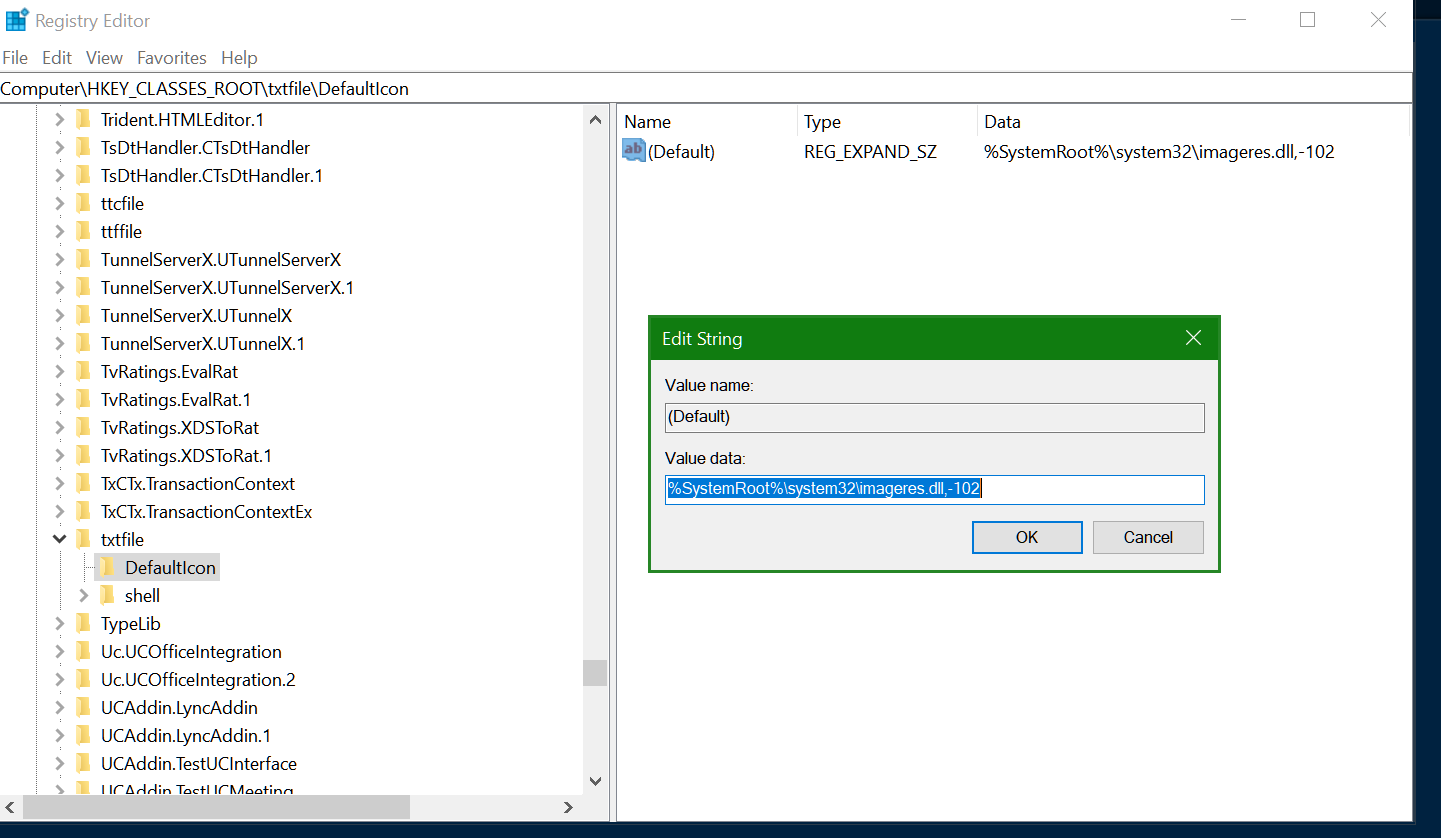 然后到路径 HKEY_CLASSES_ROOT\txtfile\DefaultIcon 下,找到 txt 文件的默认图标位置:txtfile 的子文件夹:DefaultIcon