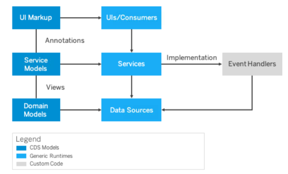 下图说明了 CDS 模型的普遍使用,它推动了通用运行时,如 CAP 服务运行时或数据库。