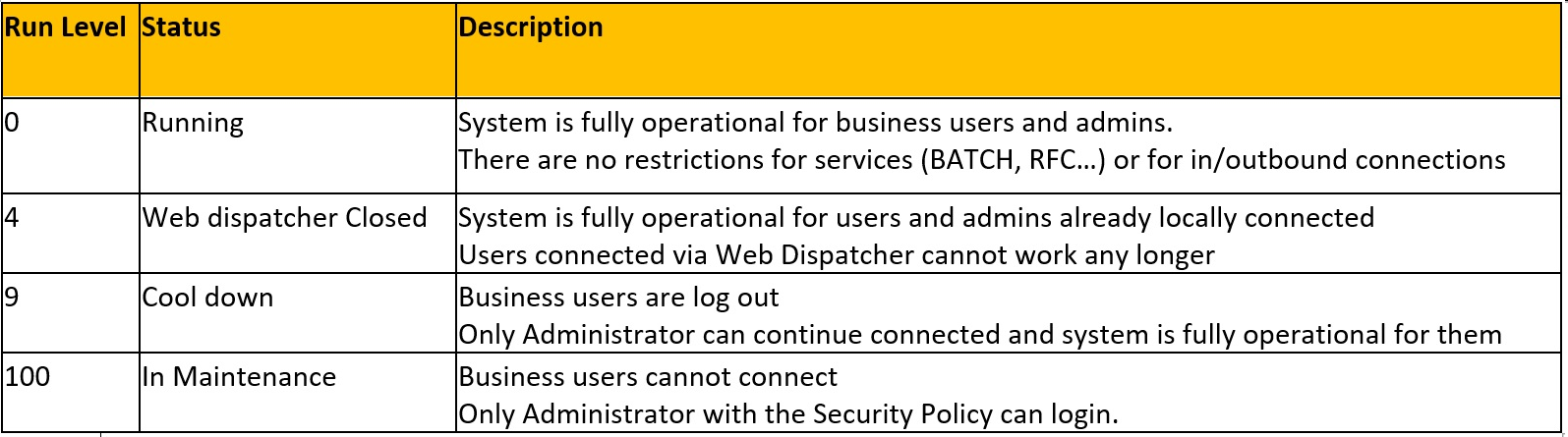 有不同的运行级别,从运行级别 0(系统在正常操作中运行)到运行级别 100(系统处于维护中),允许以更灵活的方式定义 SAP 系统的状态以及根据运行级别允许或不允许哪些操作: