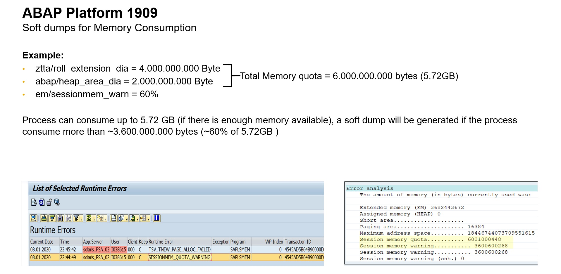 当一个进程消耗了他所有的内存配额(扩展内存 + HEAP 内存)时,会生成一个 ABAP 短转储(例如 TSV__NEW_PAGE_ALLOC_FAILED)并取消该进程作为一种保护机制,以避免整个系统崩溃。