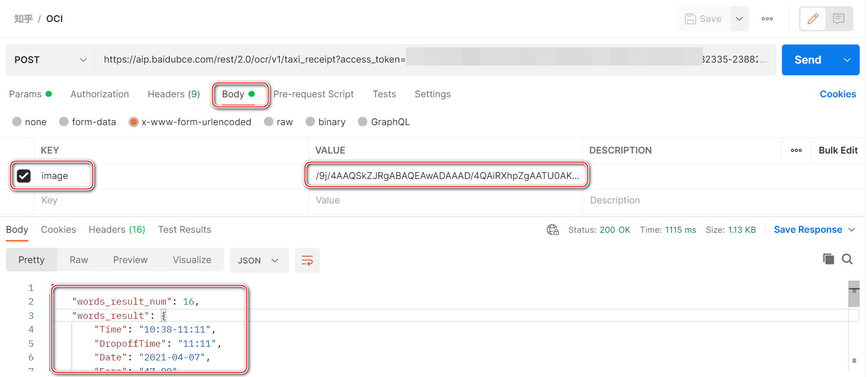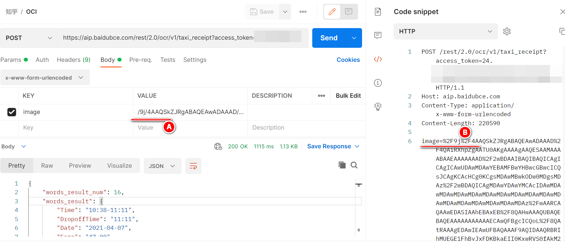 这里我们需要注意一点,在 postman 里,我们指定参数 image 的值,是没有经过 url encode 的图片 base64 encode 的值,即下图图例 A。