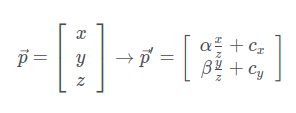 而外参的坐标变化涉及平移和旋转操作, 我们需要将其应用于每个3D点。 问题在于我们得到的投影方程的问题是涉及到 z 的除法, 这使得它们是非线性的(3维), 从而使我们无法将它们转化为更方便的矩阵向量形式.