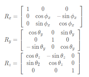 其中R被称为旋转矩阵. 在3D空间中, 点P的旋转是围绕x,y,z三个轴实现的, 因此可以表述为下面的旋转公式.