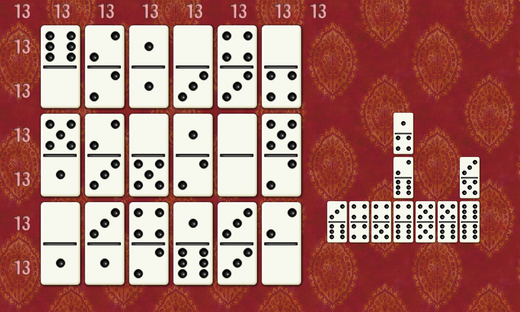 将18个数字分成6组(对应着6列),每组的和都是13,可以手算出来所有的情况: