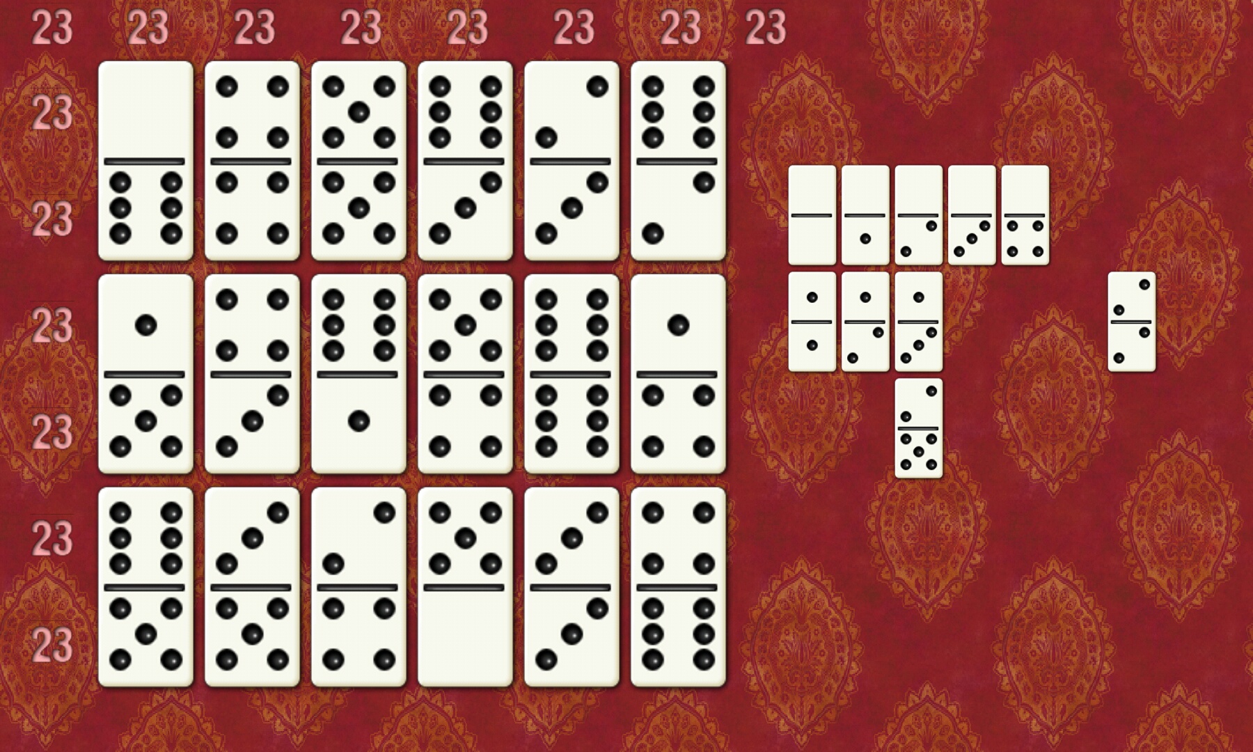 在23多米诺骨牌(2)、38多米诺骨牌(3)53(4)68(5)81(6)94(7)中,分别解决了行和、列和、对角线和均为13、14、15、16、17、18的问题。