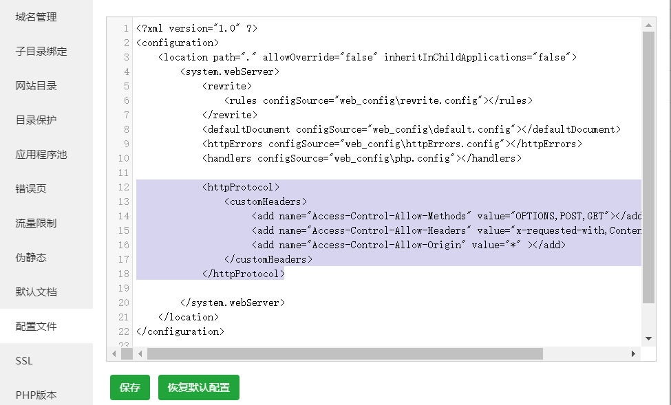 宝塔中对IIS网站开启跨域限制