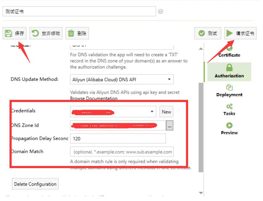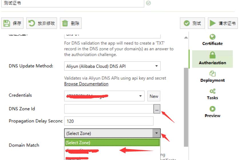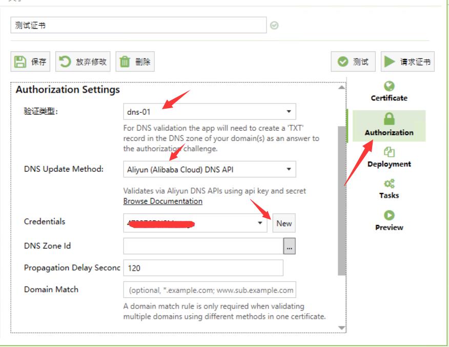 2.点击右边Authorization,验证类型选择dns-01,因为我的域名是在阿里云上,所以DNS Update Method选择Aliyun DNS API。Credentials选择右边的New。