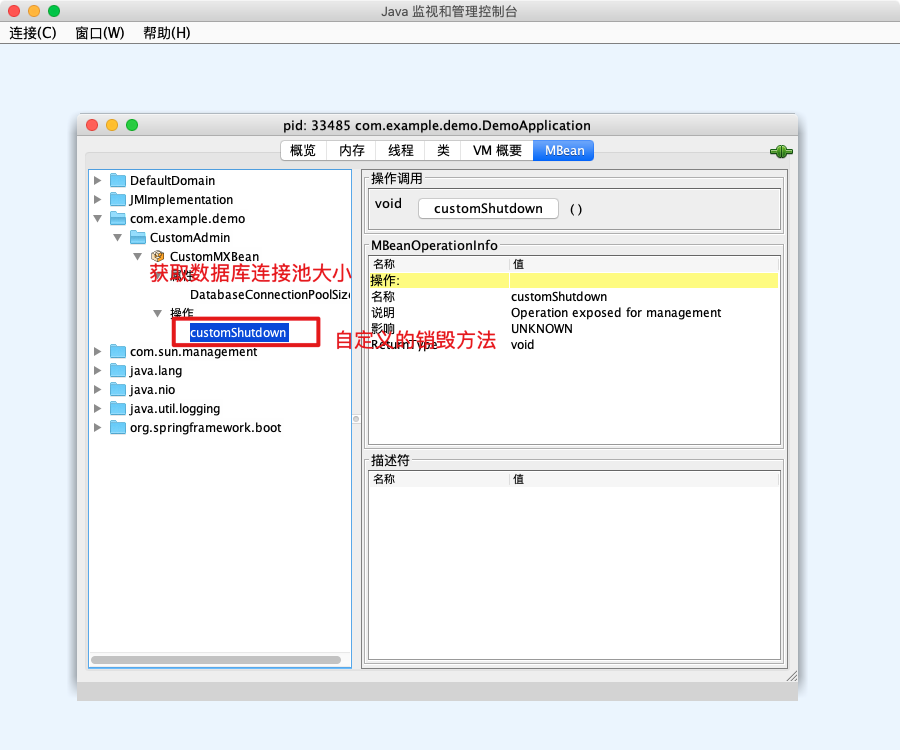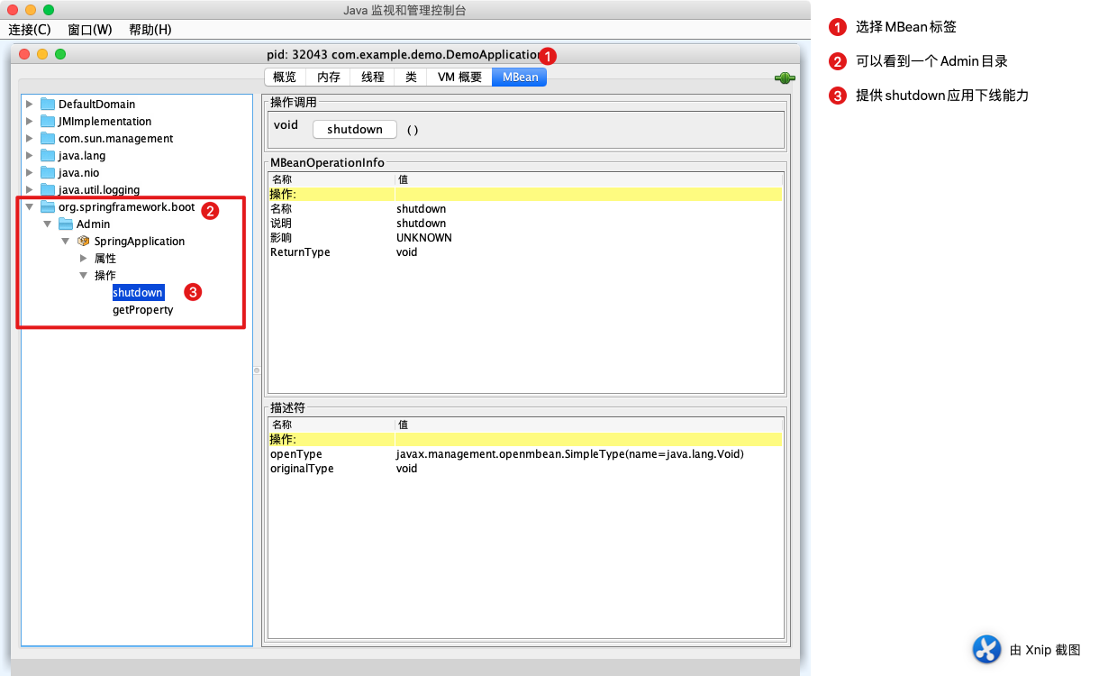 选中MBean标签,然后可以看到一个SpringApplication的类。shutdown是服务下线。