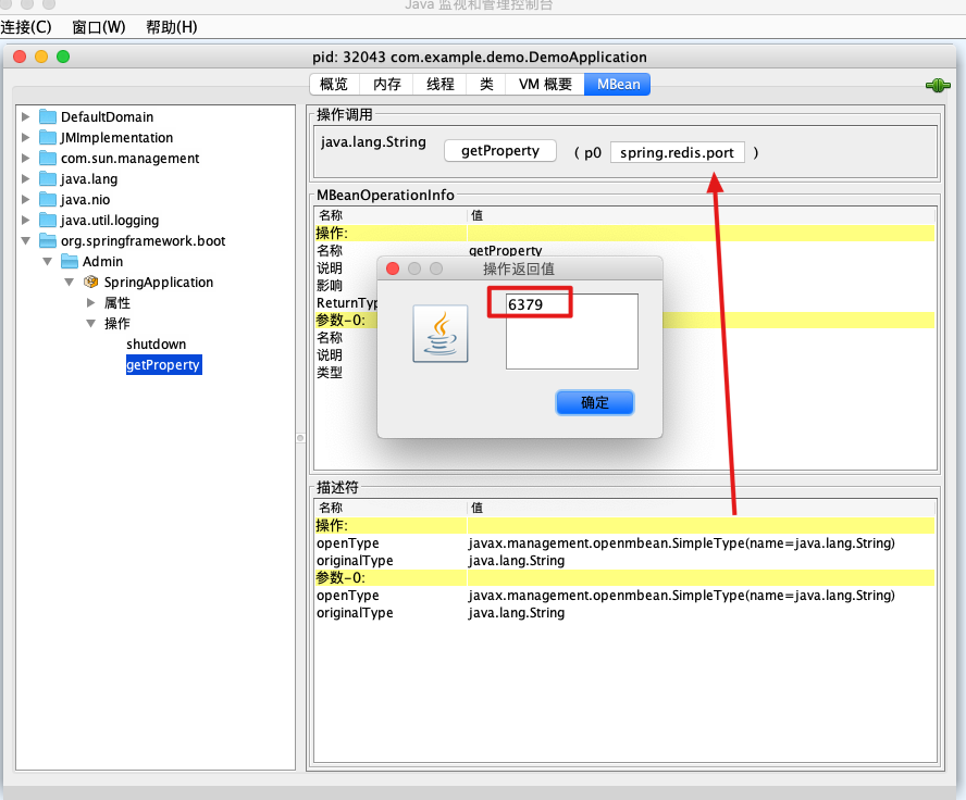 getProperty方法是获取应用中的配置信息。如图我们获取redis的相关信息。可以看到返回值是Spring应用中我们定义的值