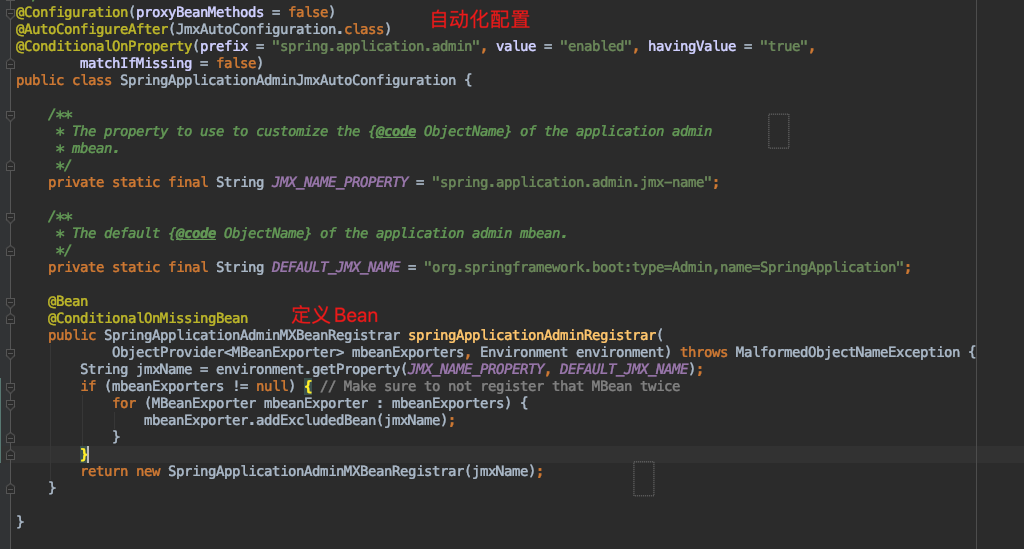 自动化配置将SpringApplicationAdminMXBeanRegistrar声明成一个Spring中的Bean对象。并配置JMX中的命名及目录。