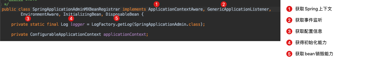 提供注册能力。这个类中我们可以知道如何注册JMX以及如何取消注册。下面我看这个类如何利用Spring提供的接口能力,来实现应用下线。及注册到JMX上的吧。