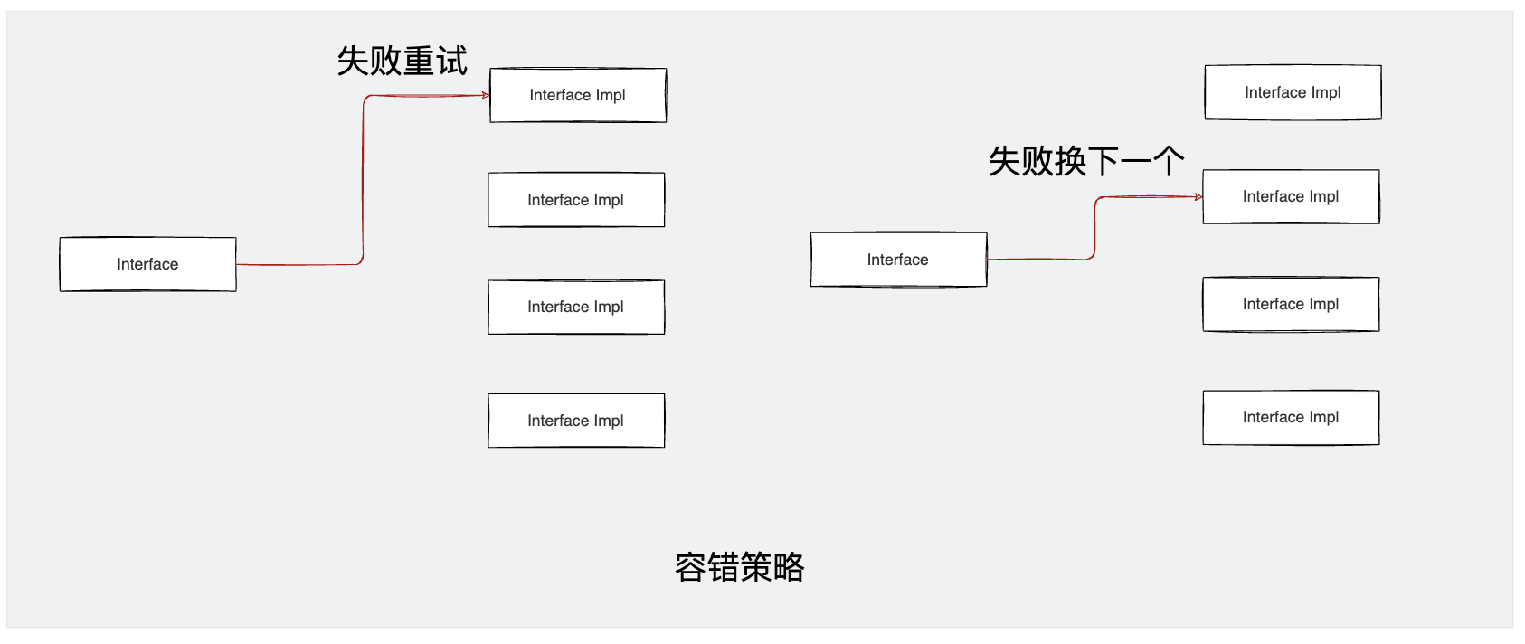 容错策略,当我们调用一台实例出错了,直接报错? 还是重试一下请求?或者是换一个实例在请求呢? 这就是容错策略。甚至我们还可以实现一个熔断器。