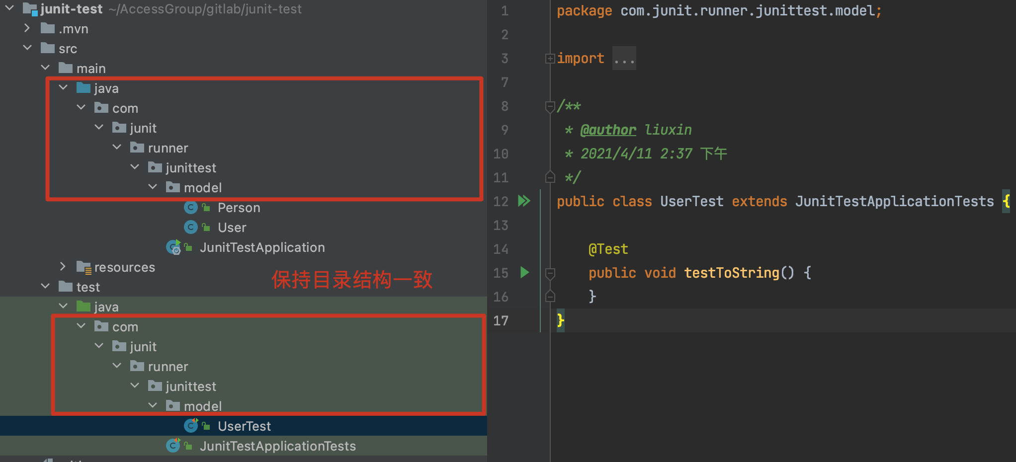 在这里有个误区,发现很多同学都是随意去创建测试类,其实这不是一个好的习惯,在Maven项目中, 要尽量保证测试类与被测类的目录结构是一致的。如下图一样。这样的好处是,我们可以快速在...