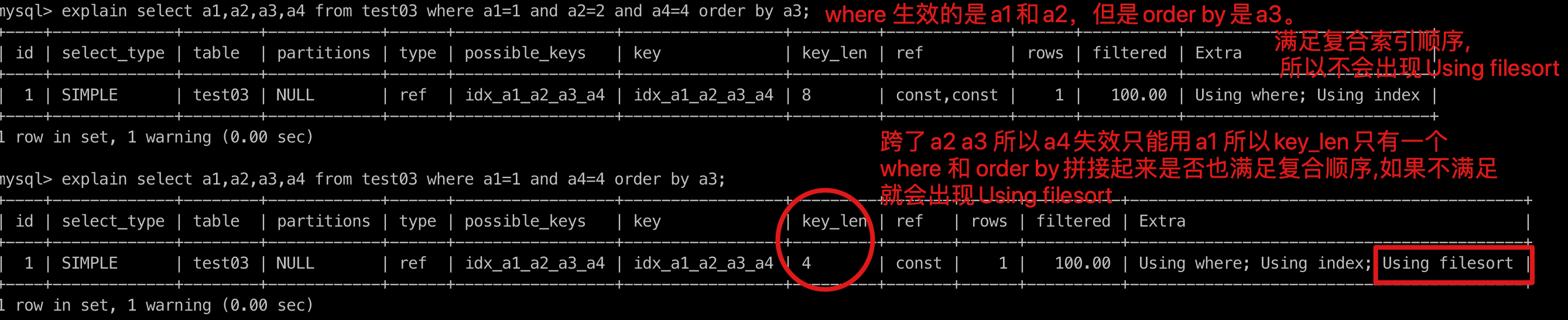 - 跨了a2 a3 所以a4失效只能用a1 所以key_len只有一个 where 和 order by拼接起来是否也满足复合顺序,如果不满足 就会出现Using filesort