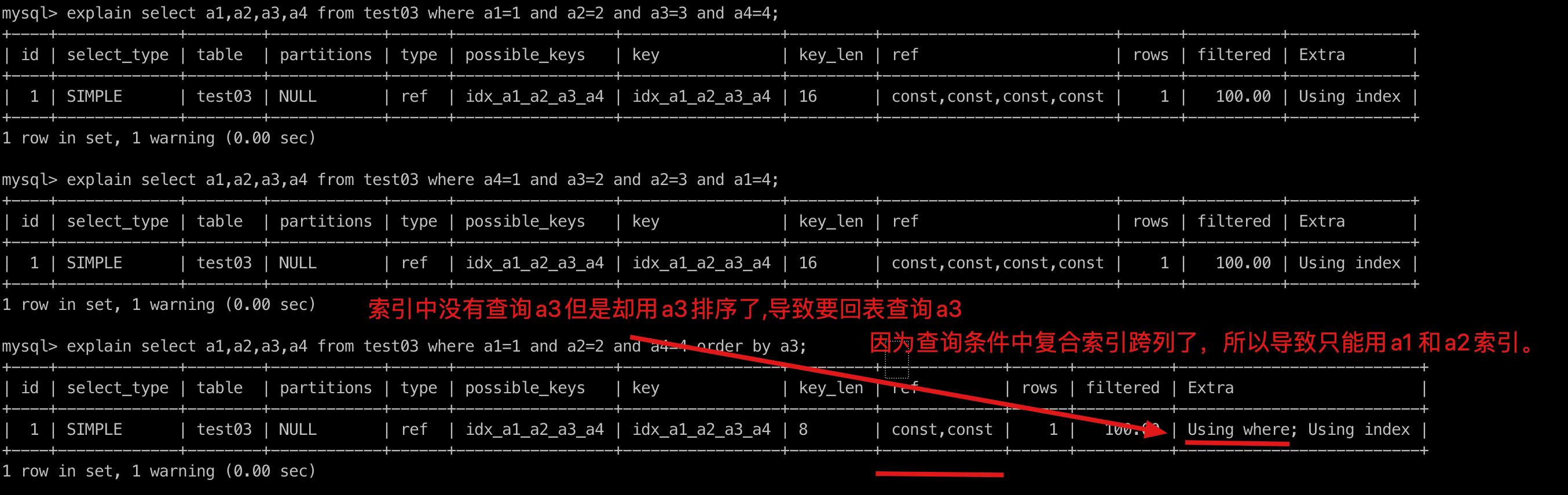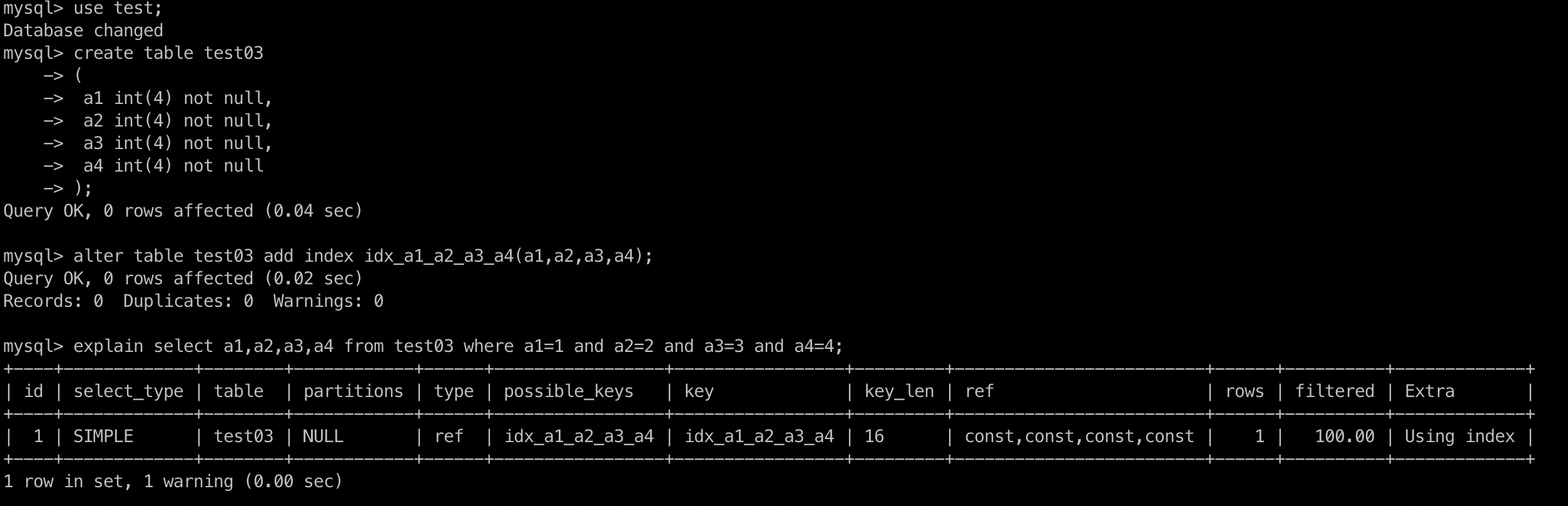 alter table test03 add index idx_a1_a2_a3_a4(a1,a2,a3,a4);
