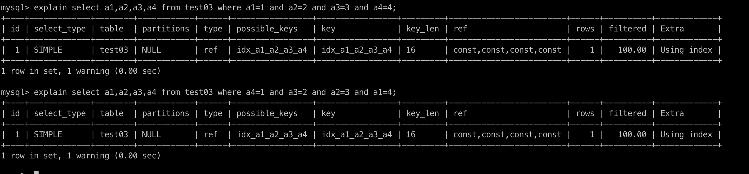 explain select a1,a2,a3,a4 from test03 where a4=1 and a3=2 and a2=3 and a1=4;