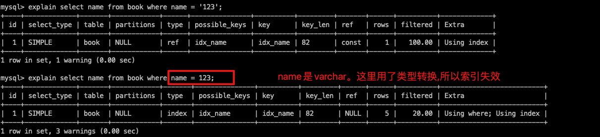 - 尽量不要使用类型转换(显式、隐式),否则索引失效。where name = 'lx' 可以。where name