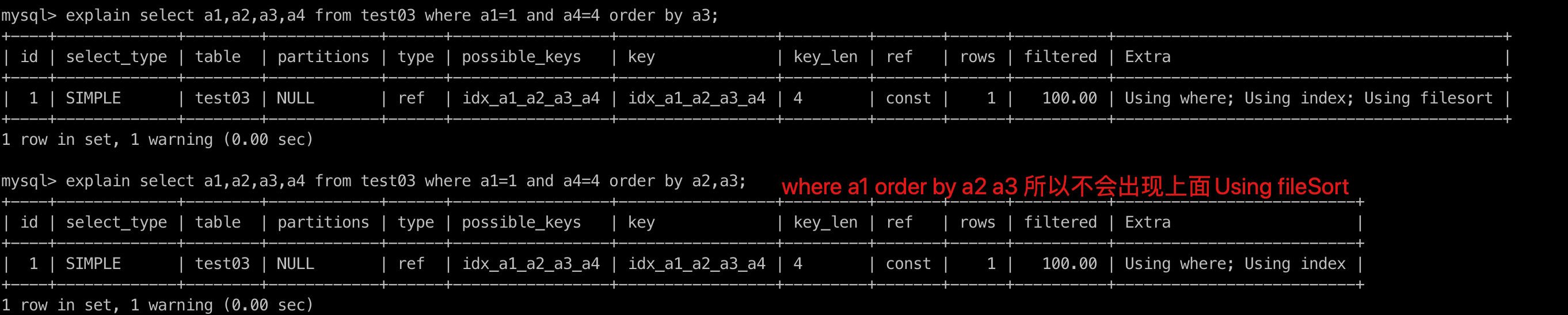 explain select a1,a2,a3,a4 from test03 where a1=1 and a2=2 and a4=4 order by a3;