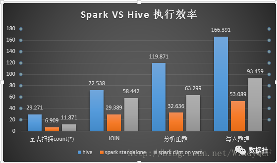 Spark提供了存计算,可以将计算结果存放到内存中,我们都知道MR是将数据存储在磁盘,对磁盘读写,势必会增加IO操作,计算时间过长。之前我也做过一个Hive和Spark的一个执行效率的对比,当时使用的是Spark1.6,数据是千万级别的表。