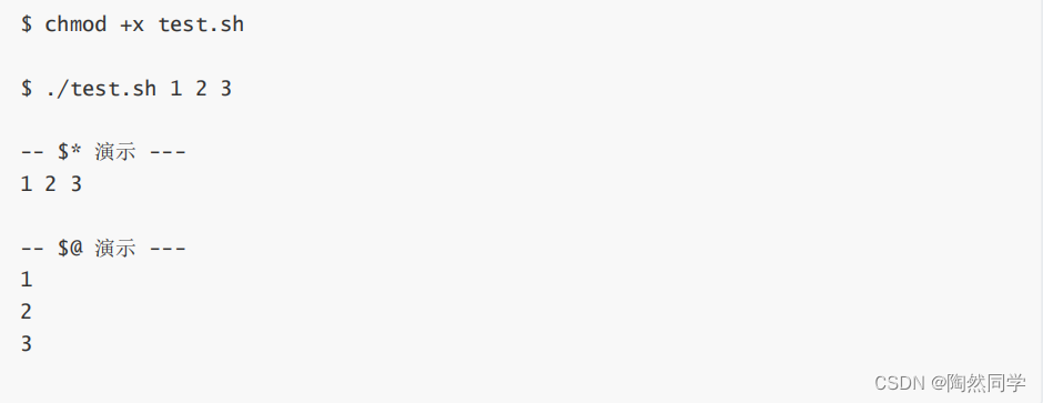 "1 2 3" (传递了一个参数),而 "@" 等价于 "1" "2" "3" (传递了三个参数)。