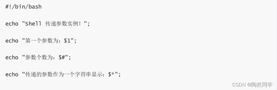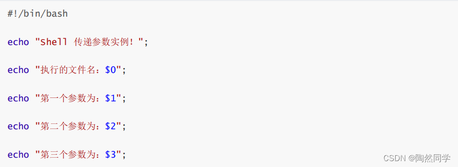 我们可以在执行 Shell 脚本时,向脚本传递参数,脚本内获取参数的格式为: $n 。