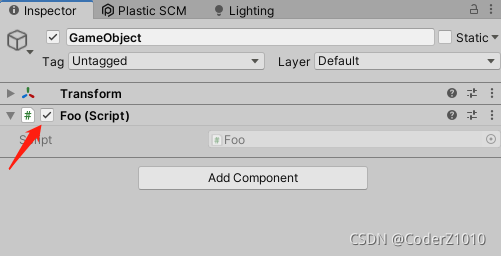 在Unity编辑器中激活、取消激活某个脚本组件只需要在Inspector检视面板中将该脚本组件前的开关勾选、取消勾选即可。