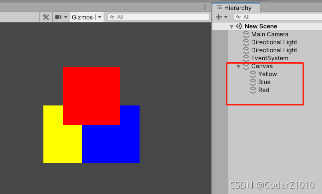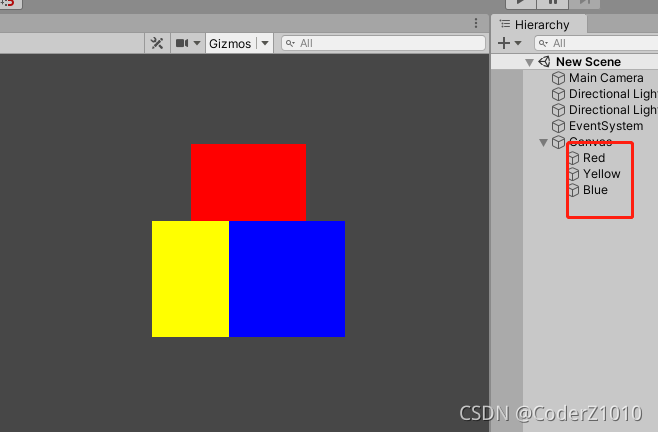 在Unity的Hierarchy层级面板中,层级在下的会遮挡住层级在上的UI视图,如下图所示,有三个Image物体Red、Yellow、Blue 层级从上到下,在Scene窗口中可以看见蓝色在最上层,会遮挡住黄色和红色、黄色在中间层,被蓝色遮挡但会遮挡红色,红色在最下层。
